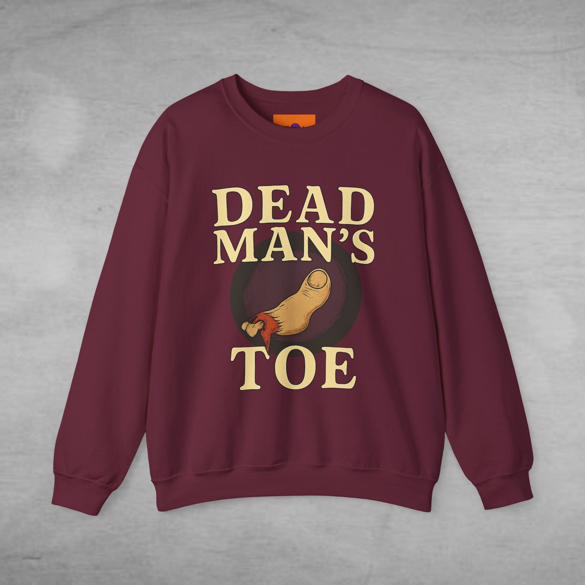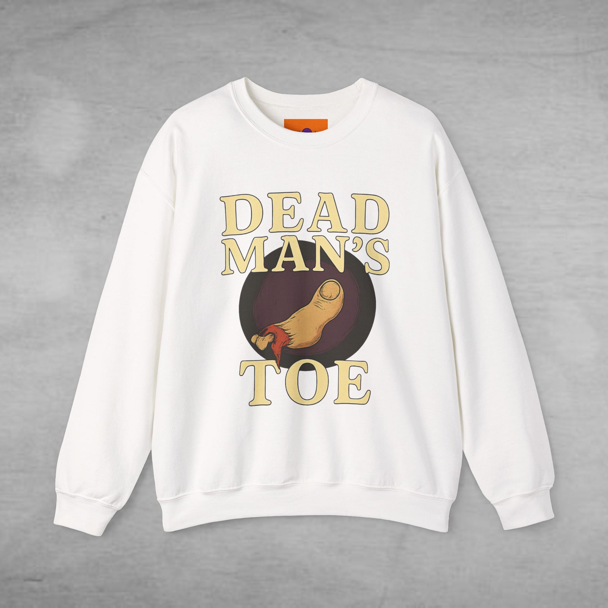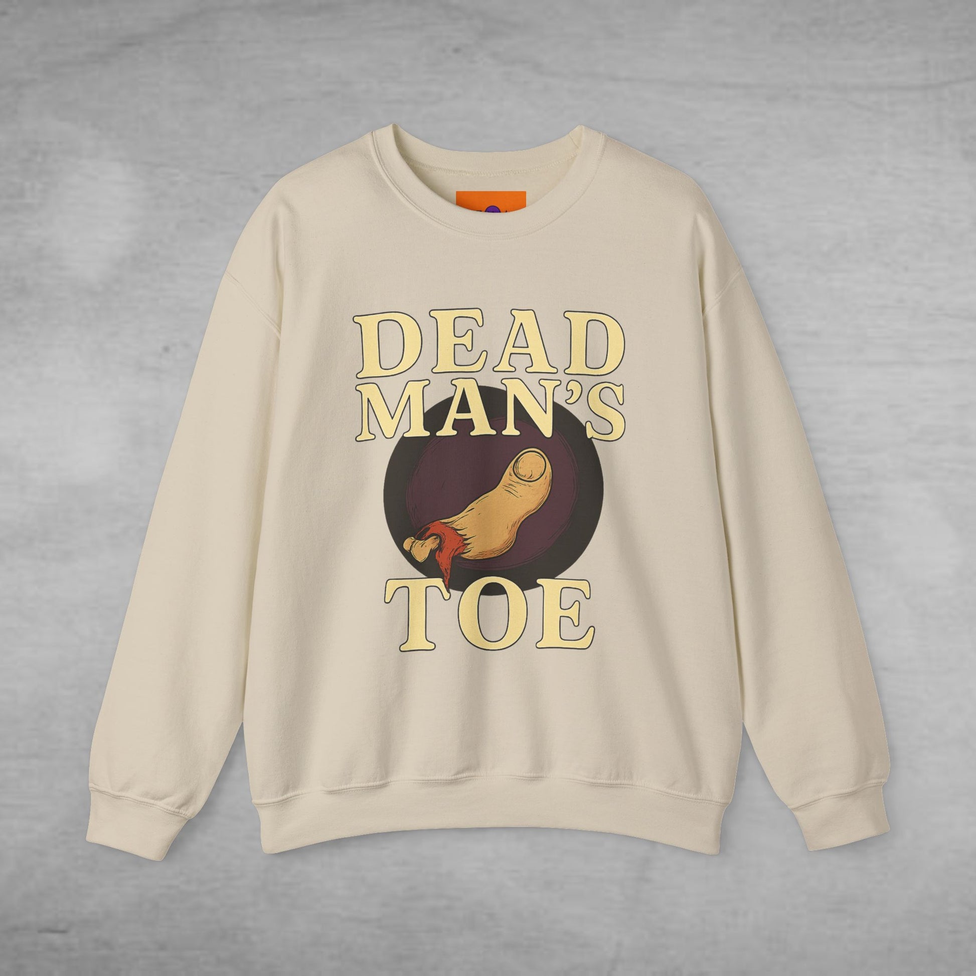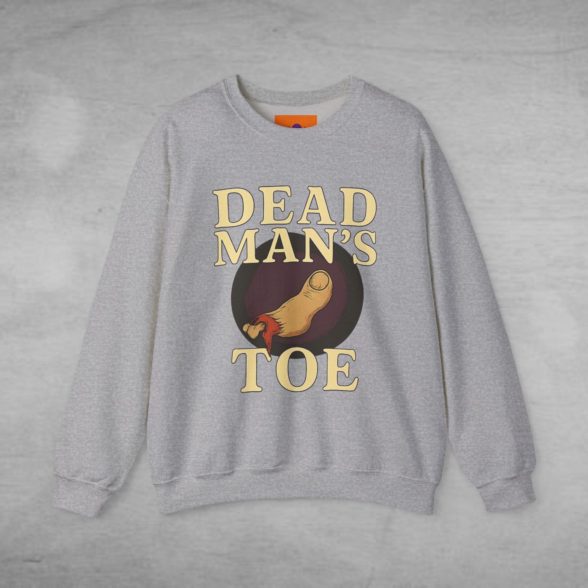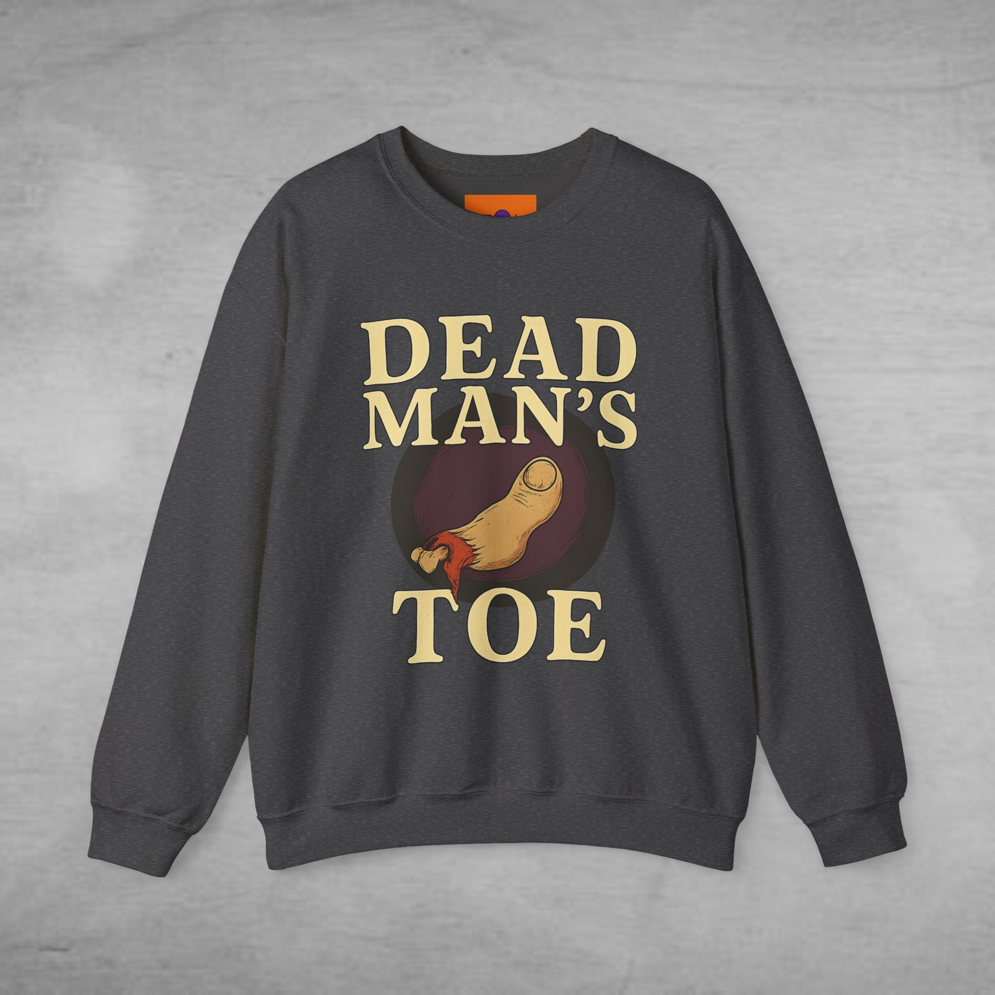 A Dead Man's Toe Sweatshirt inspired by the movie Hocus Pocus, perfect for Halloween. This cozy and durable sweatshirt is made with a medium-heavy fabric blend of cotton and polyester, featuring a classic fit with a crew neckline for a comfortable wearing experience. It is ideal for adults looking for a spooky and festive addition to their wardrobe during the Halloween season.