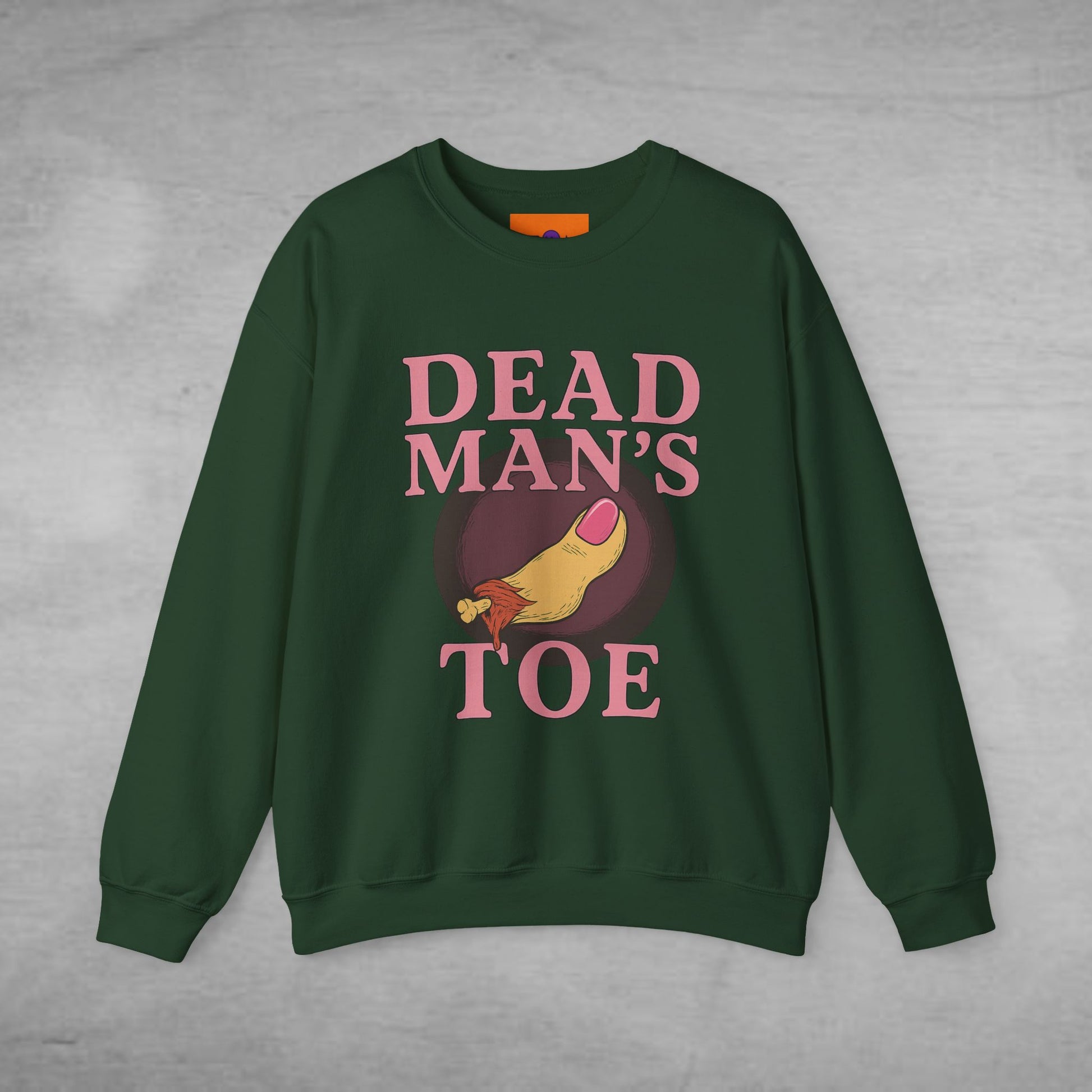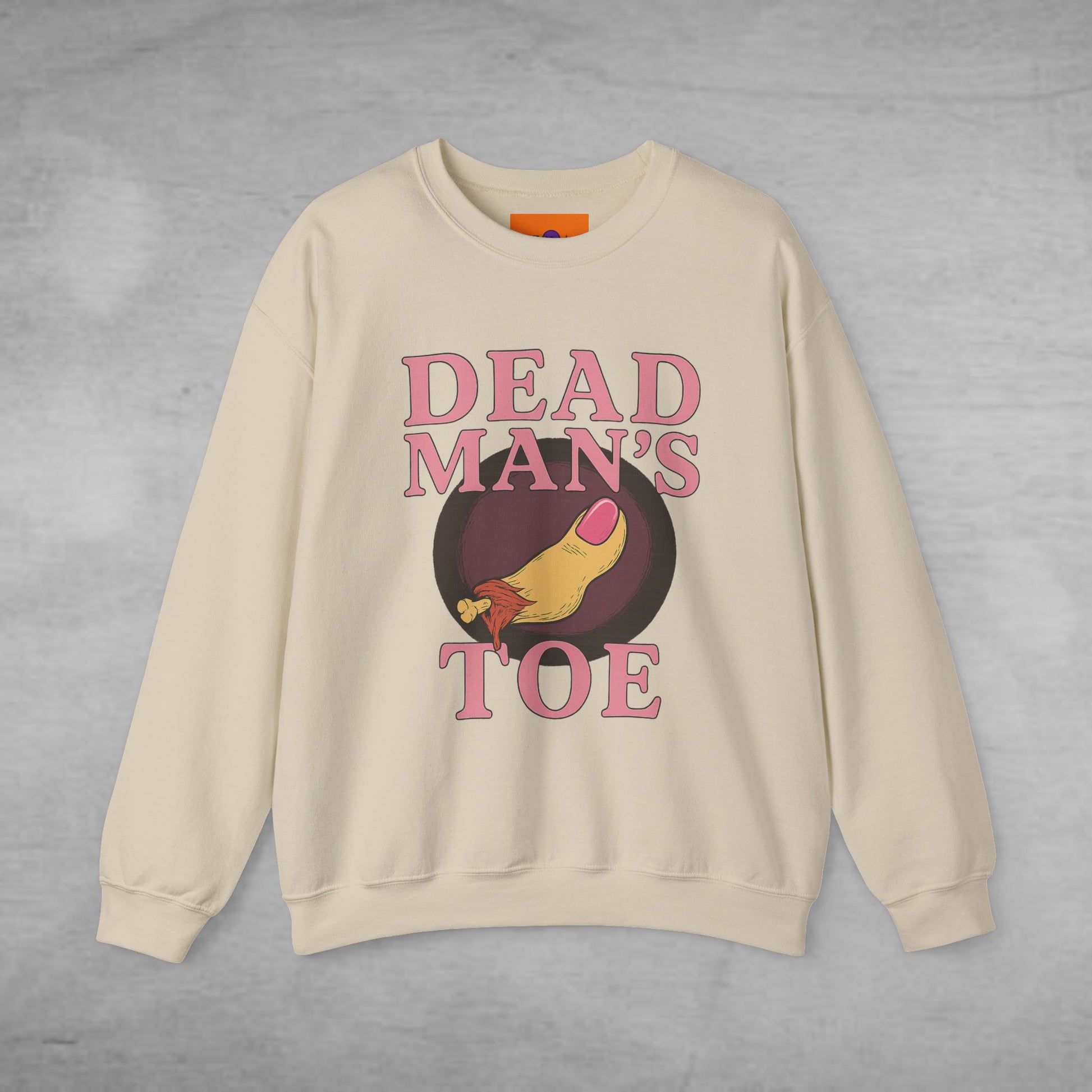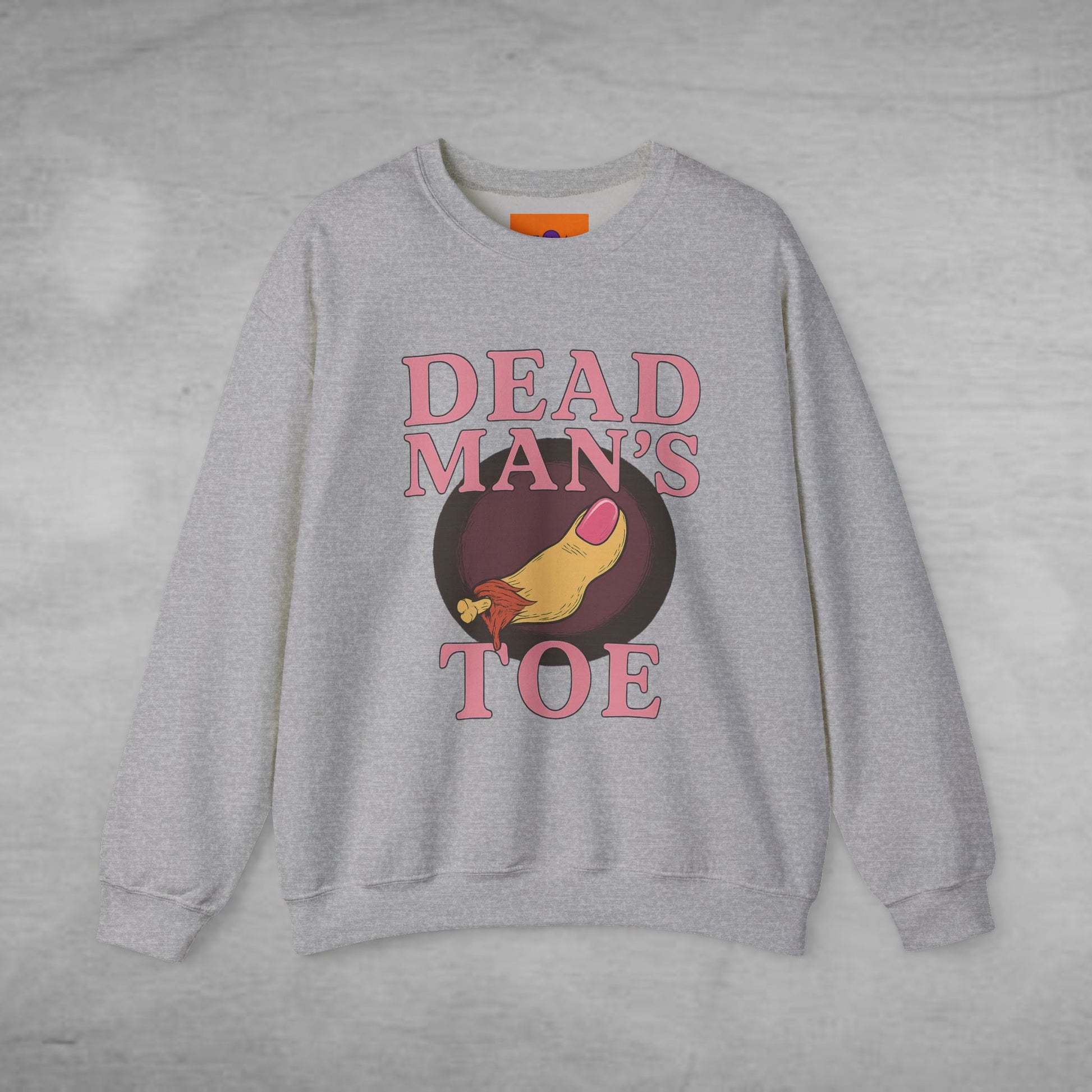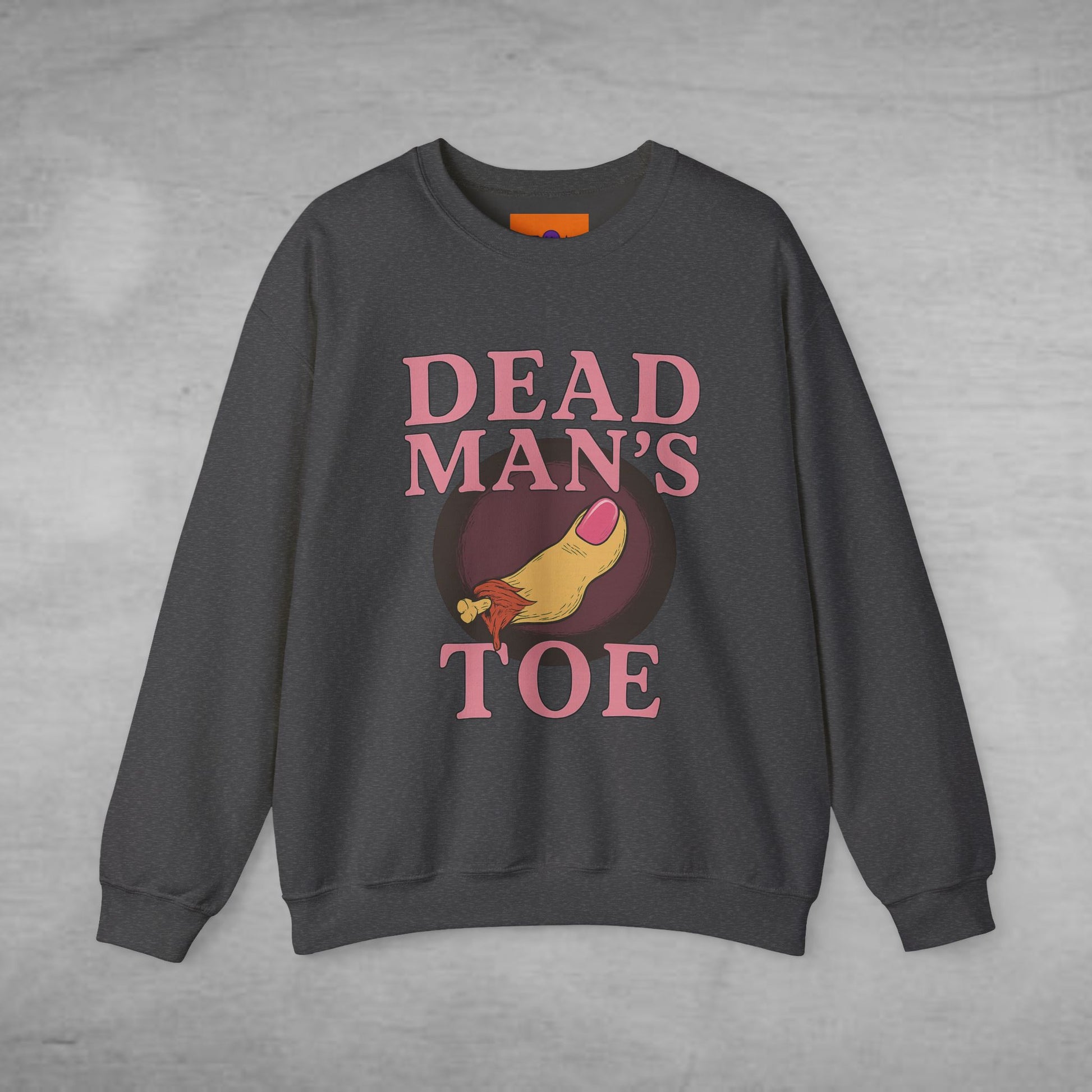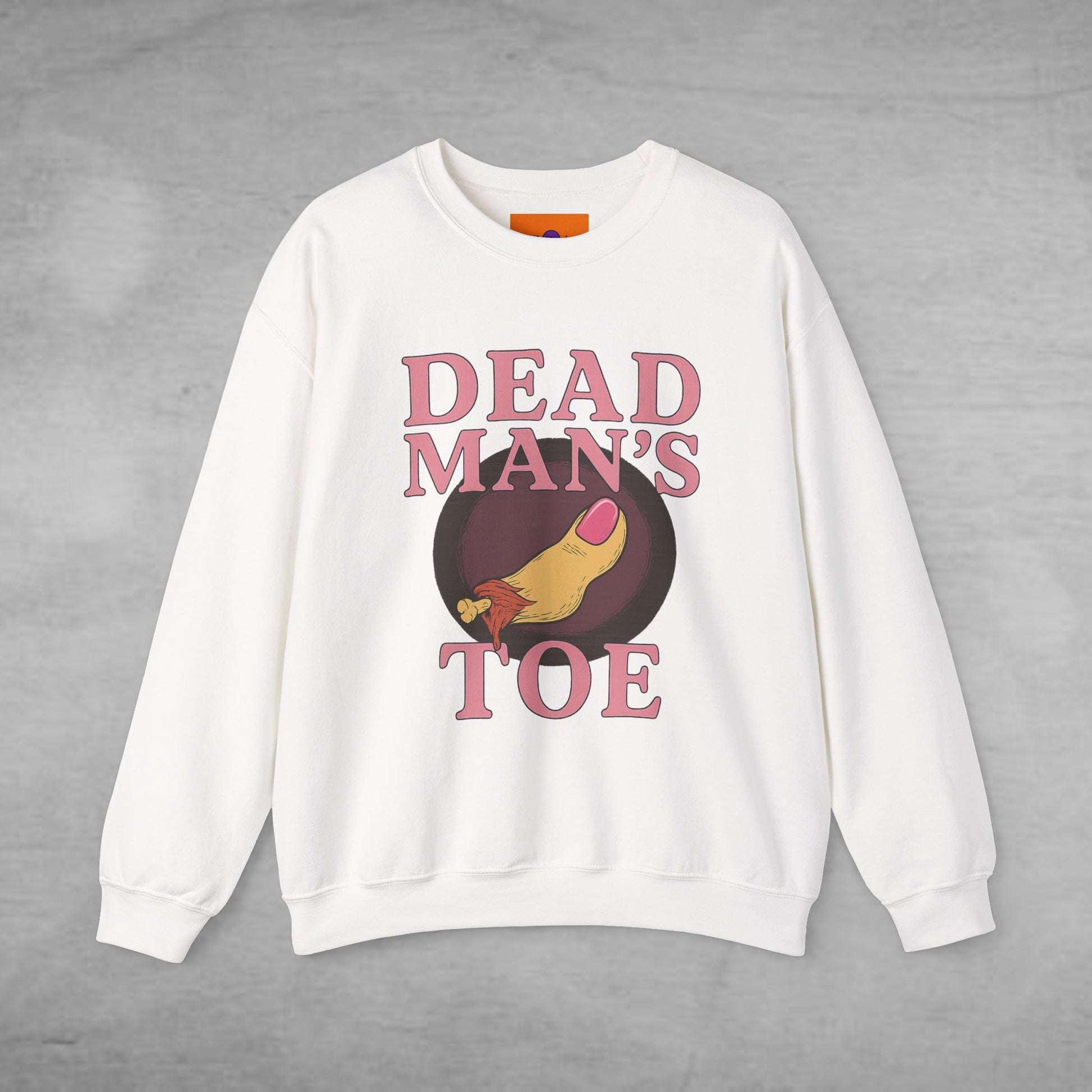 A Dead Man's Toe Sweatshirt inspired by the movie Hocus Pocus, perfect for Halloween. This cozy and durable sweatshirt is made with a medium-heavy fabric blend of cotton and polyester, featuring a classic fit with a crew neckline for a comfortable wearing experience. It is ideal for adults looking for a spooky and festive addition to their wardrobe during the Halloween season.